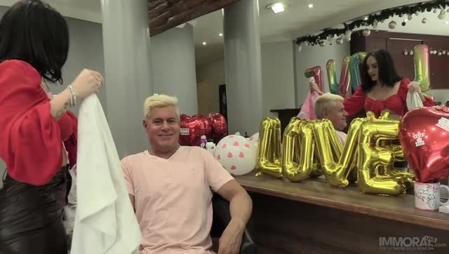 Two workers please a blonde